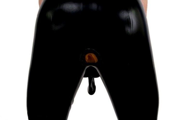 latex footless tights with attached front ribbed anatomical sheath. Made from genuine 0.4 sheet latex.