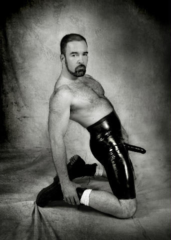 A hand tailored pair of rubber male tights with attached socks and front zipper.