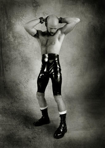A pair of tailored Latex Bermuda shorts with a front ribbed Anatomical penis sheath attached